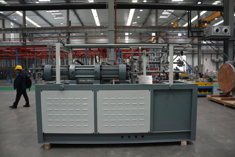 全钒液流电池电堆是储能系统的“ 动力心脏”。据车间工作人员介绍,杭氧研发的42kW全钒液流电池电堆能量效率大于82%,性能优异且运行稳定,处于行业先进水平,可应用于新能源发电侧储能、电厂的调峰调频等领域。氢液化透平膨胀机是获取深低温冷量的核心部件。“我们创新研发的氢液化透平膨胀机采用多级串联方式进行布局,车间内展示的为第一级膨胀机,可在大于10万rpm的超高转速下稳定运行,并且能够适应高压、25K深低温的严苛氢气环境,在确保机组零泄漏的同时,能有效抑制热传导损失。”车间一位技术人员告诉记者。