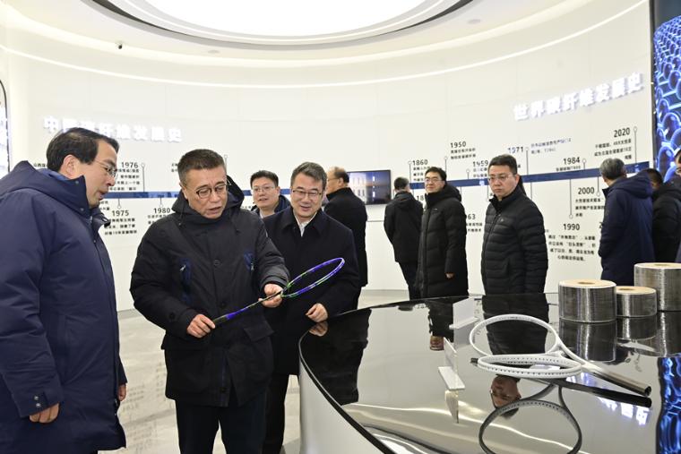 仪式后,与会领导和嘉宾共同参观了华阳碳材公司展厅、中央控制室、碳化车间,详细了解华阳T1000级高性能碳纤维研发历程、技术优势、工艺流程及应用场景等。