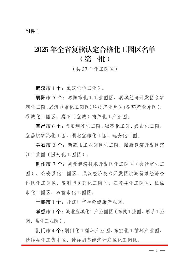根据《湖北省化工园区建设标准和认定管理实施细则》(鄂经信原材料〔2025〕51号)要求,省经信厅会同省自然资源厅、省生态环境厅、省住建厅、省交通运输厅、省应急管理厅,组织开展了全省化工园区新一轮复核认定工作。经园区申请、市州初审,省直部门资料审查、现场审核和专家评审、综合审议、网上公示,并报经省政府审核批准,确定37个化工园区为全省第一批复核认定合格化工园区。现予以公告,欢迎社会各界进行监督。
