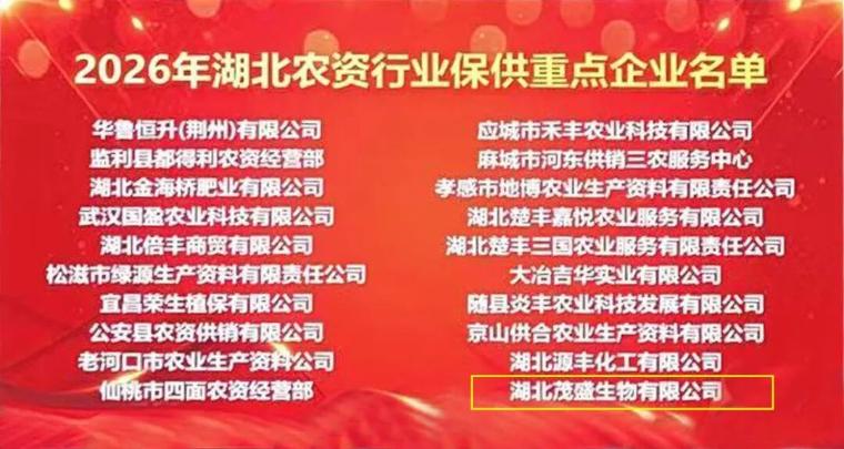 中化新网讯 3月20日下午,中国农业生产资料流通协会正式公布了“2026年中国农资流通协会春耕保供重点农资企业名单”,湖北茂盛生物有限公司凭借雄厚的综合实力与突出的社会责任感,连续多年荣耀登榜,也是随州市唯一入选该国家级名单的企业。